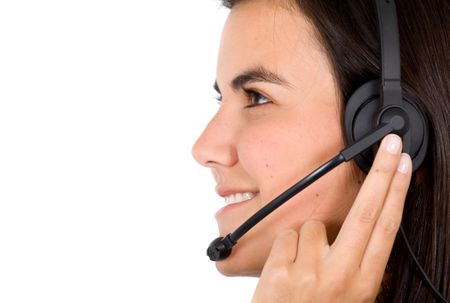 customer service girl smiling with hand on headset - isolated over a white background