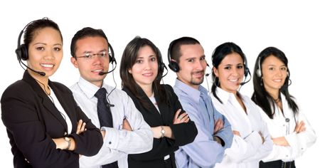 customer service team led by an asian business woman over a white background