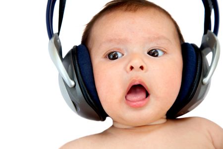 Cute baby with earphones listening music isolated on white