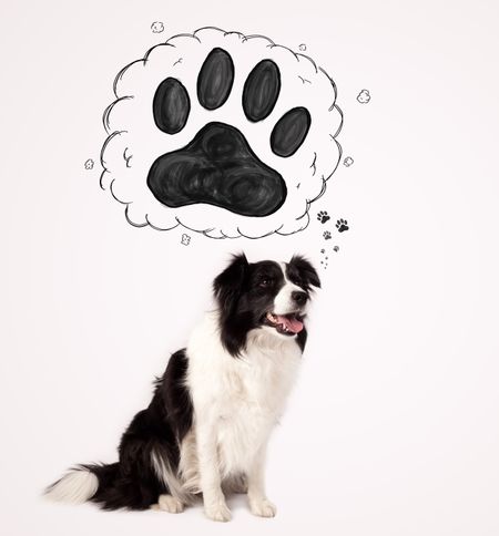 Cute black and white border collie thinking about a paw in a thought bubble above her head