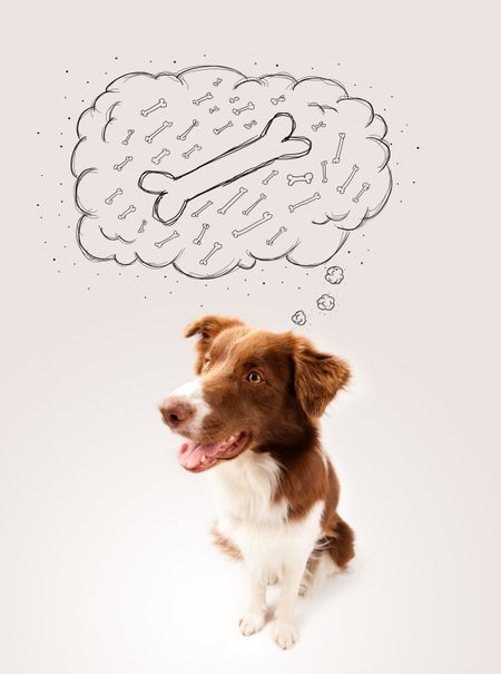 Cute brown and white border collie sitting and dreaming about a bone in a thought bubble