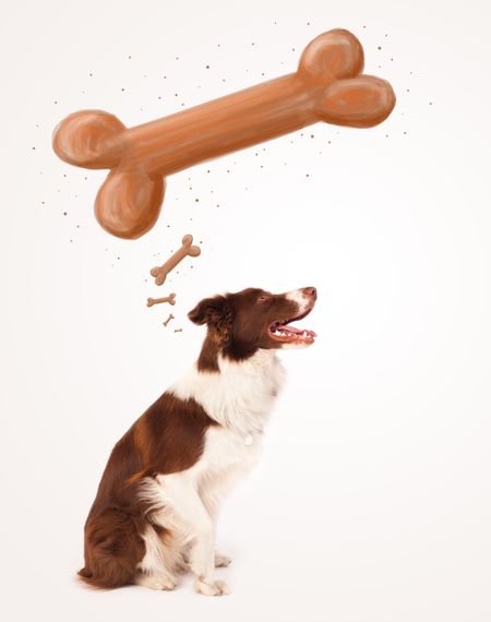 Cute brown and white border collie sitting and dreaming about a bone above his head