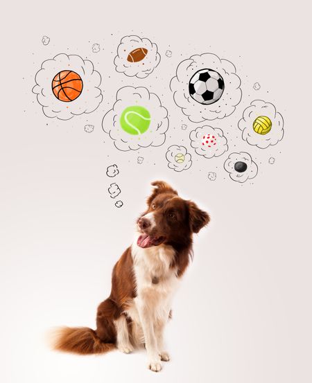 Cute brown and white border collie thinking about balls in a thought bubbles above his head