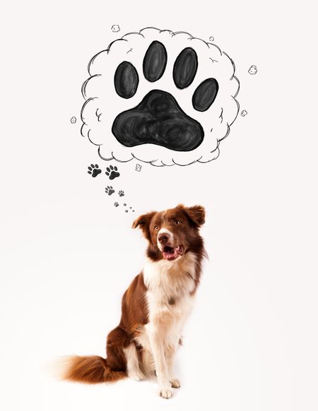 Cute brown and white border collie thinking about a paw in a thought bubble above his head