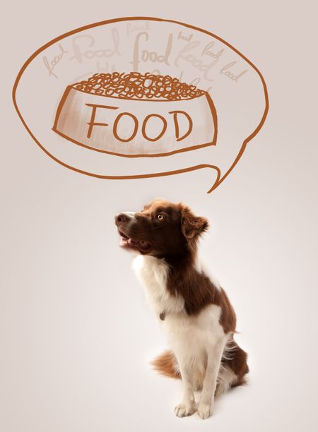 Cute brown and white border collie thinking about a bowl of food in a thought bubble above his head
