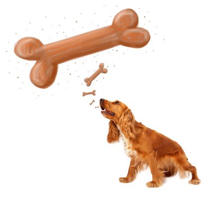 Cute cocker spaniel sitting and dreaming about a bone over her head