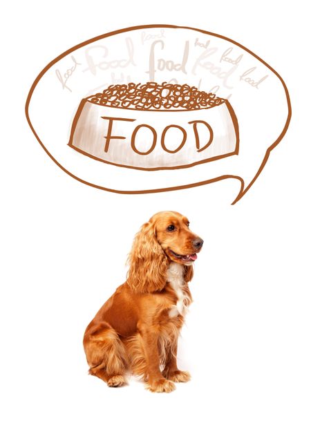 Cute cocker spaniel thinking about a bowl of food in a thought bubble above her head