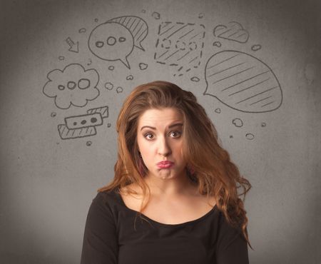 A cute female student making funny expressions with thoughts in her head illustrated by drawn chat bubbles on the urban wall background concept.