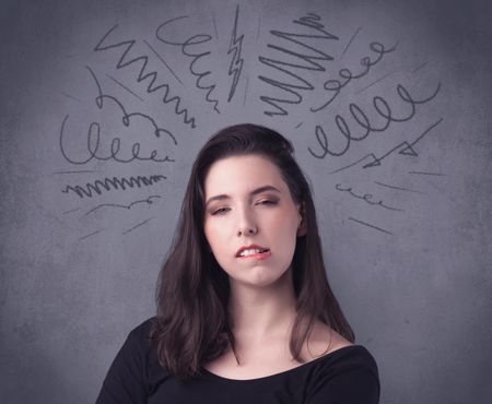 A cute female student making funny face expressions with pressure and problems in her head illustrated by drawn lines, marks and spirals on the urban wall background concept.