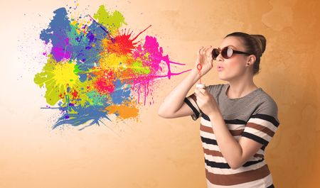 Cute girl blowing bubble spalsh graffiti into wall