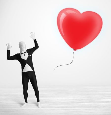 Cute guy in morpsuit body suit looking at a red balloon shaped heart