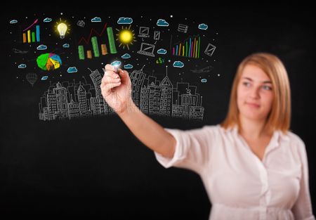 Cute woman sketching city and graph icons and symbols