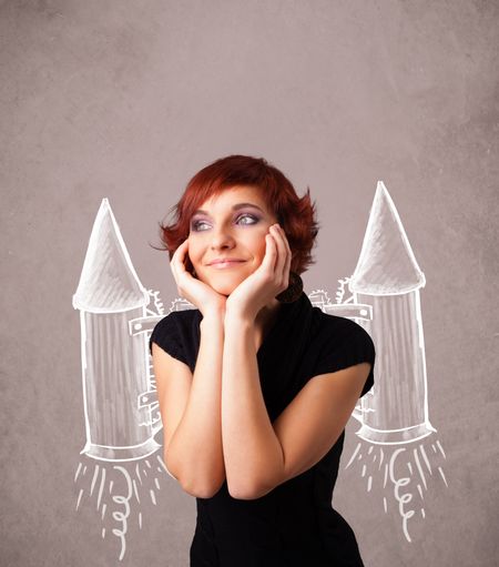 Cute young girl with jet pack rocket drawing illustration