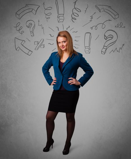 Cute young girl with question sign doodles on gradient background