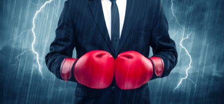 A dangerous sales person getting ready for a fight concept with red boxing gloves and thunder lightning in background.
