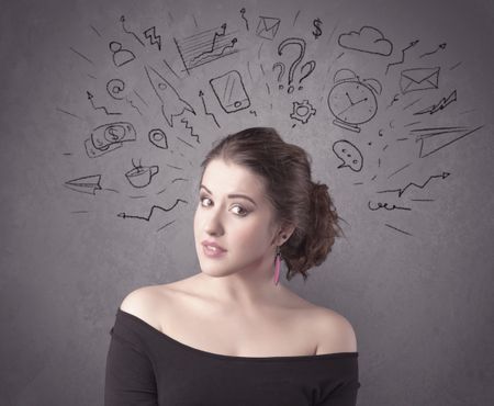 A dark brown haired pretty teenage girl with thoughts in her head illustrated by question mark, rocket, money, coffee, clock, email, social life icons drawn on the background wall concept.