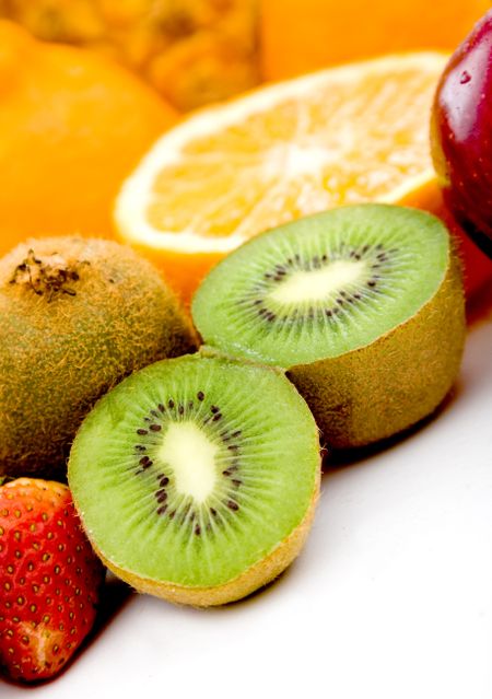 delicious fruit of all kinds isolated over a white background - focus is on kiwi