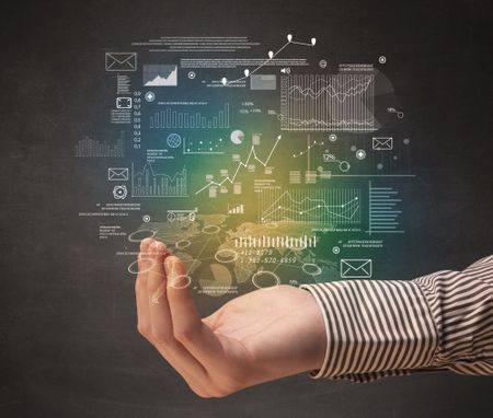 Demographic related charts, diagrams and graphs hovering over young hand