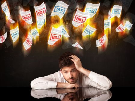 Depressed businessman sitting under falling papers