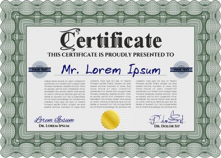 Diploma or certificate template. Vector illustration. With complex background. Lovely design. Green color.