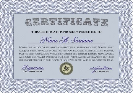 Diploma template. With background. Border, frame. Excellent design. Blue color.