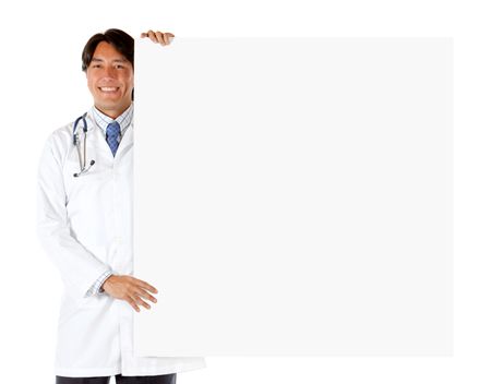 Doctor with a banner isolated over a white background