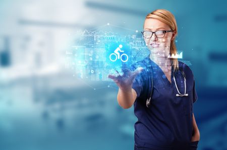 Doctor touching hologram screen displaying healthcare running symbols