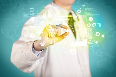 A doctor in white coat with a stethoscope on one shoulder holding a pill with green glowing graphs, lines, numbers, charts, between his fingers