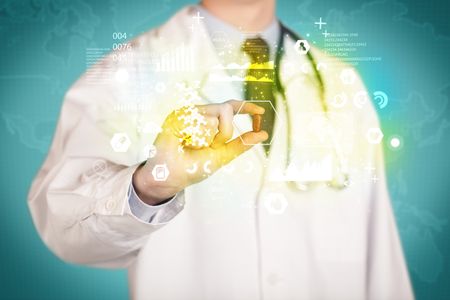 A doctor in white coat with a stethoscope on one shoulder holding a pill with green glowing graphs, lines, numbers, charts, between his fingers