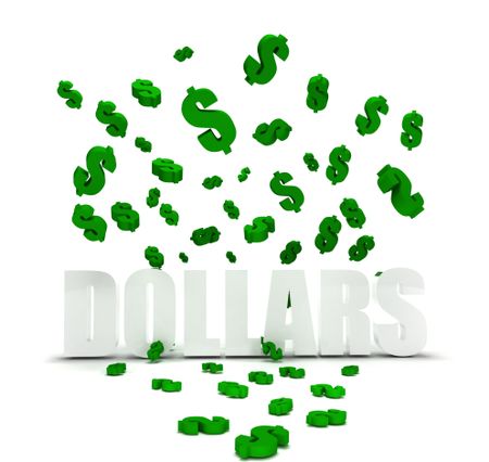 Dollar symbol raining over the word 'dollars' isolated
