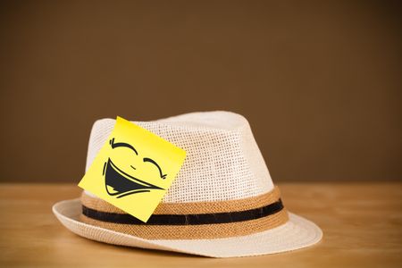 Drawn smiley face on a post-it note sticked on a hat