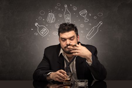 Drunk down and out man with doodle alcohol bottles concept