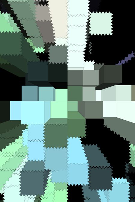 Earthquake in a city: Parti-colored 3-D abstract of office buildings with serrated edges in top and bottom thirds to indicate disruption