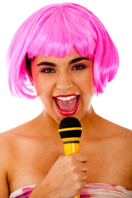 Eccentric woman singing with microphone and pink wig - isolated over white