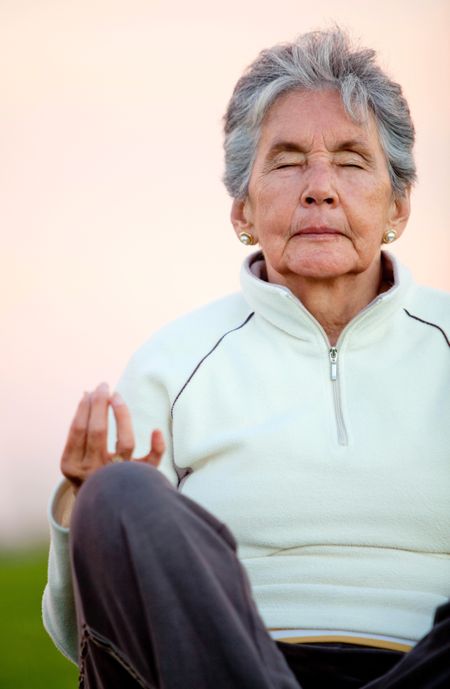 Elder woman doing yoga exercises outdoors - fitness concepts