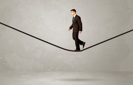An elegan businessman in suit balancing on a tight rope with a briefcase in front of grey urban wall background environment concept