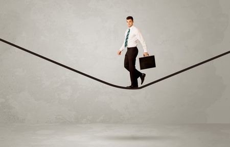An elegan businessman in suit balancing on a tight rope with a briefcase in front of grey urban wall background environment concept
