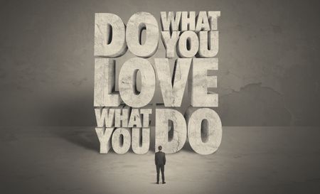 An elegant business person getting advice to do what you love from big letters illustration in grey empty environment concept
