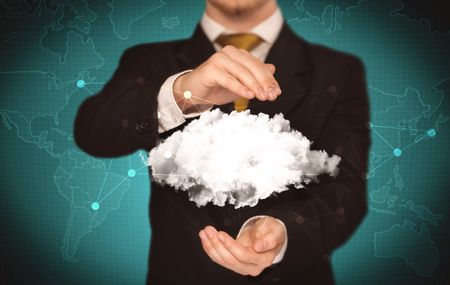 Elegant business person holding an empty white cloud in its hands in front of green wall background with world map illustration concept