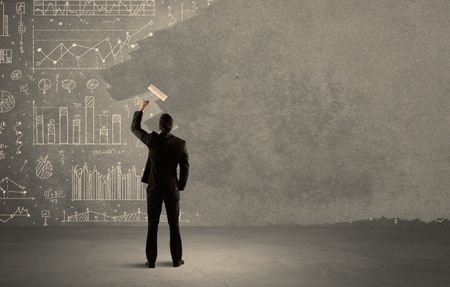 An elegant businessman covering pie charts, statistics, numbers, data, graphs on urban concrete wall with fresh paint using a roller concept