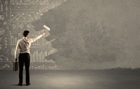 An elegant businessman covering pie charts, statistics, numbers, data, graphs on urban concrete wall with fresh paint using a roller concept