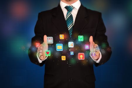 Elegant businessman holding colorful mixed media icons