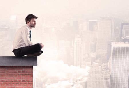 An elegant businessman in modern suit sitting on the top of a brick building, looking over the cityscape with clouds concept
