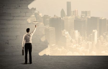 An elegant businessman with a paint roller transforming a brick wall into urban city landscape including tall buildings concept