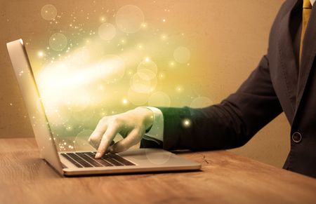 An elegant businessman sitting at desk and pushing the buttons of his laptop keyboard while working very fast illustration concept