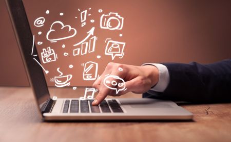 An elegant businessman sitting at desk and pushing the buttons of his laptop keyboard while working on everyday office tasks illustration concept