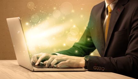 An elegant businessman sitting at desk and pushing the buttons of his laptop keyboard while working very fast illustration concept
