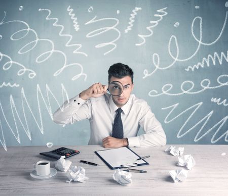 An elegant businessman sitting at office desk and working on keyboard with drawn curves, lines illustration on background wall concept