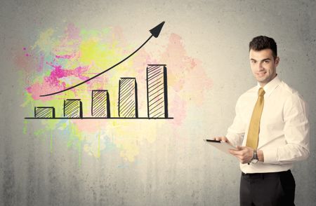 An elegant businessman standing in front of a grey wall with colorful growing chart drawing concept