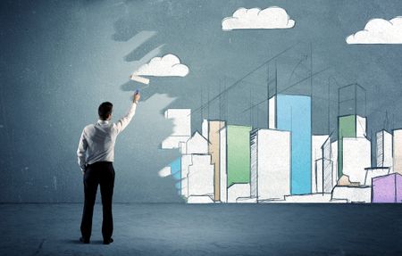 An elegant businessman standing with a paint roller transforming a blue wall into urban city landscape drawing sketch including skyscrapers and clouds concept